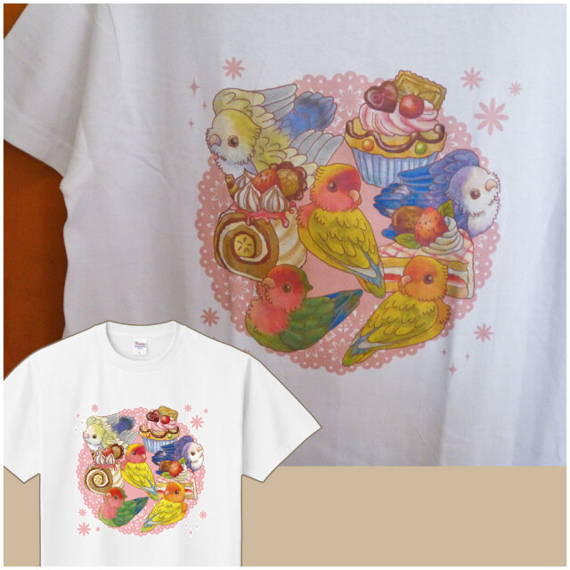 ケーキとインコのイラスト半袖Tシャツ。男女兼用MでレディースL相当でゆったり着れます。しっかりした生地なので秋口の重ね着にも向いてます。
