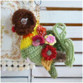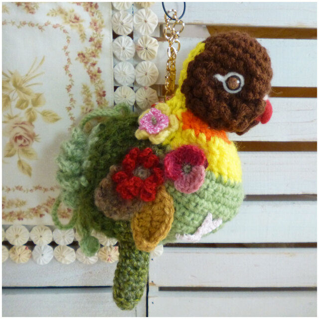 お花で着飾ったのあみぐるみインコの身体に小物が入れられる巾着。バッグチャーム式チェーンが付いてるのでお手持ちの鞄の持ち手に下げられます。おまけのレース巾着付き。