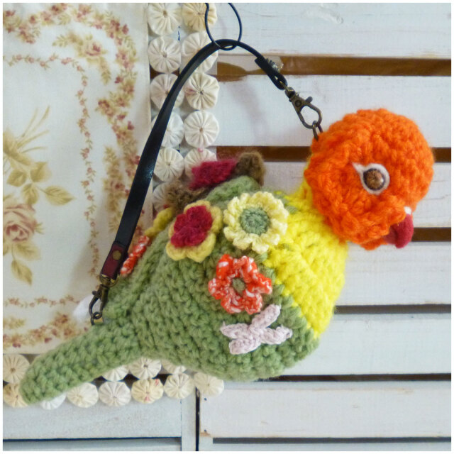 お花で着飾ったあみぐるみインコの身体に小物が入れられるポーチ。片翼が蓋になっています。着脱式の持ち手が付いてるので、お手持ちの鞄の持ち手に下げてポケットとしても活用できます。おまけのレース巾着付き。