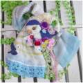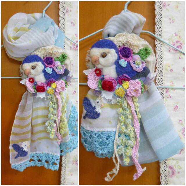 ワンポイントで編みインコ(ホワイトヘッドバイオレット)が入っているガーゼストールと、それを止めるストール止めのセット(ホワイトフェイスバイオレット)。