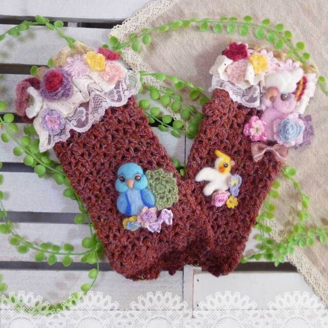 ウール混糸を透かし編みしてレースや編みモチーフの花、羊毛インコをアシンメトリーに配置したガーリーなハンドカバー。おまけで白い手袋をつけてます。カバーだけ指出しで使ったり、お手持ちの手袋と合わせる事もできます。