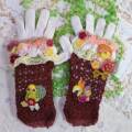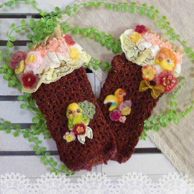 ウール混糸を透かし編みしてレースや編みモチーフの花、羊毛インコをアシンメトリーに配置したガーリーなハンドカバー。おまけで白い手袋をつけてます。カバーだけ指出しで使ったり、お手持ちの手袋と合わせる事もできます。