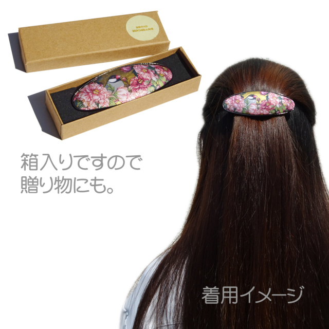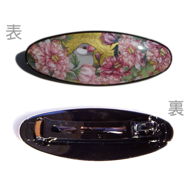 牡丹と文鳥。咲き乱れる牡丹の中にひっそりともっふりとたたずむ文鳥さん。絢爛ながら落ち着いたデザインのバレッタ(髪留め)です。部分的にラメを施していますので光が当たるとより煌めきます。