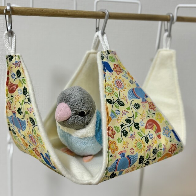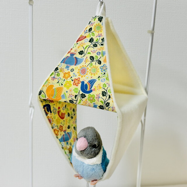 外布、綿生地。内布、フリース。薄くて軽量ですが、とても暖かく柔らかさも十分。リバーシブルでALLシーズン使用可。テントからハンモックまで、色々な使い方ができるバードテント。底板も外れお手入れ簡単。※取付用金具は、付属しておりません。※ぬいぐるみ、おもちゃは付属品ではありません。複数枚ご購入の場合は、個々により柄の出方が異なりますのでご了承ください。