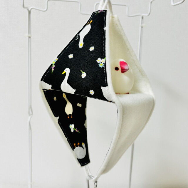 外布、綿生地。内布、フリース。薄くて軽量ですが、とても暖かく柔らかさも十分。リバーシブルでALLシーズン使用可。テントからハンモックまで、色々な使い方ができるバードテント。底板も外れお手入れ簡単。※取付用金具は、付属しておりません。※ぬいぐるみ、おもちゃは付属品ではありません。複数枚ご購入の場合は、個々により柄の出方が異なりますのでご了承ください。