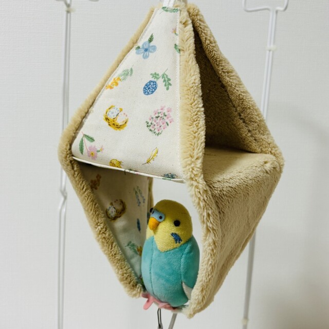 外布、綿生地。内布、猫ボア。猫の毛並みをイメージしたふわふわしたボア生地。リバーシブルでALLシーズン使用可。テントからハンモックまで幅広く使えるバードテント。底板も外れお手入れ簡単。※取付用金具は、付属しておりません。※ぬいぐるみ、おもちゃは、付属品ではありません。複数枚ご購入の場合は、個々により柄の出方が異なりますのでご了承ください。