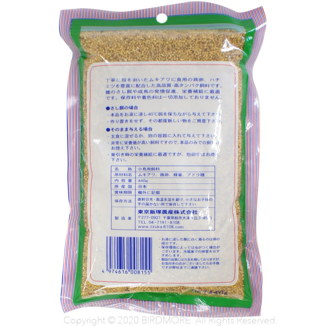 通販コーナートップフード 単品穀物 9990105【東京飯塚農産】あわ玉 440g 価格: ¥550 (税込) [ポイント還元 5ポイント~] 販売期間: 数量: 袋 在庫: 6袋 在庫 6袋 特定商法・返品についての詳細はこちら 9990105 精選したむき粟に豊富に玉子と蜂蜜を配合し栄養分をそのまま保つ様に特許低温乾燥した理想的な飼料です。フィンチ類・小型インコ類の差し餌や栄養補給・繁殖用飼料などにどうぞ。 ご使用方法 ●親鳥の発情促進に。 ●手乗りビナや巣立ちビナの栄養補給に。 ●一般の飼料とは別の容器に少量与えてください。 ●お湯で溶いたときに白く濁るのは卵の成分です。 ●高単位の飼料ですからこの飼料だけで飼育しないでください。 メーカー/東京飯塚農産株式会社 内容量/440g おすすめ関連商品 9991262【カワイ】ワンタッチ ツボ巣掛け ¥440(税込) 在庫 1 個 9991302【コバヤシ】アニマルバード/K-90 ¥605(税込) 在庫 1 個 9990829【コバヤシ】育て親セット/K-1 ¥352(税込) 在庫 7 個 9991477【コバヤシ】育て親・餌入れなし/K-2◆ ¥220(税込) 在庫 13 本 9990934【スドー】フードポンプ 10cc ¥704(税込) 在庫 4 個