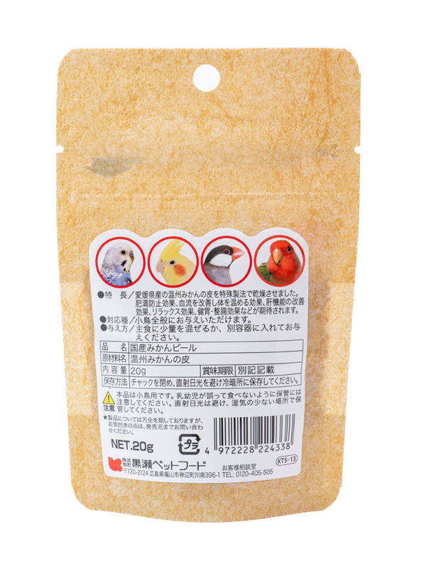 通販コーナートップフード 単品穀物 9997958【黒瀬ペットフード】国産みかんピール 価格: ¥385 (税込) [ポイント還元 3ポイント~] 販売期間: 数量: 袋 在庫: 27袋 在庫 27袋 特定商法・返品についての詳細はこちら 9997958 愛媛県産の温州みかんの皮を特殊製法で乾燥させました。 肥満防止効果、血流を改善し体を温める効果、肝機能の改善効果、リラックス効果、健胃、成鳥効果などが期待されます。 メーカー/黒瀬ペットフード 内容量/20g 原材料名/温州みかんの皮 対応種/小型~大型インコ 【ご注意】 チャックを閉め、直射日光を避け冷暗所に保管して下さい。