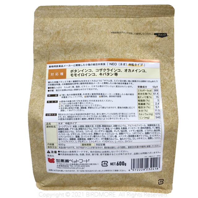 優れた栄養バランスで長く健康的な生活を送れるように「オウム目、スズメ目の飼い鳥に推奨される飼料100gあたりの栄養含有量」の栄養推奨を参考に動物医薬品メーカーと開発した小鳥の総合栄養食(ペレットタイプ)です。