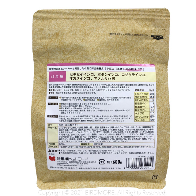 優れた栄養バランスで長く健康的な生活を送れるように「オウム目、スズメ目の飼い鳥に推奨される飼料100gあたりの栄養含有量」の栄養推奨を参考に動物医薬品メーカーと開発した小鳥の総合栄養食(ペレットタイプ)です。