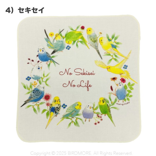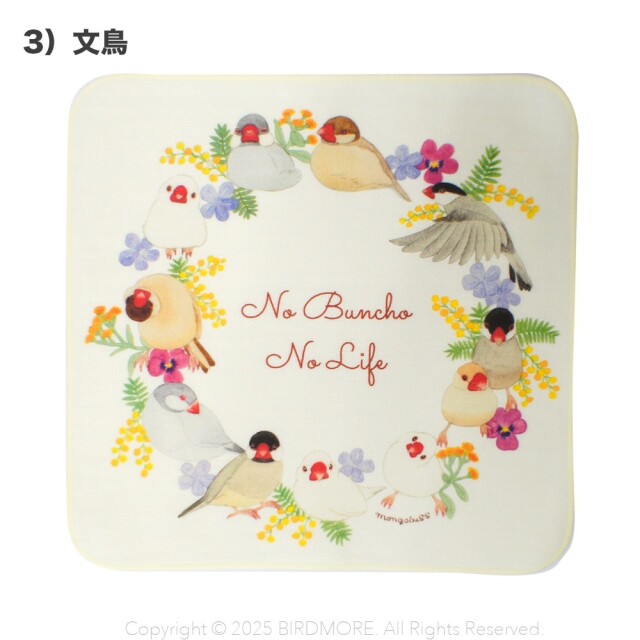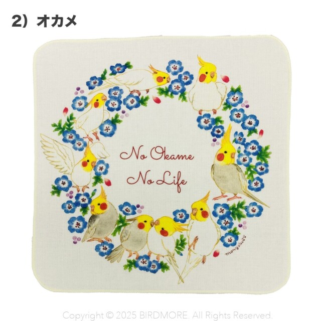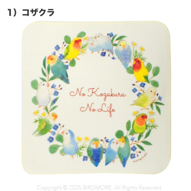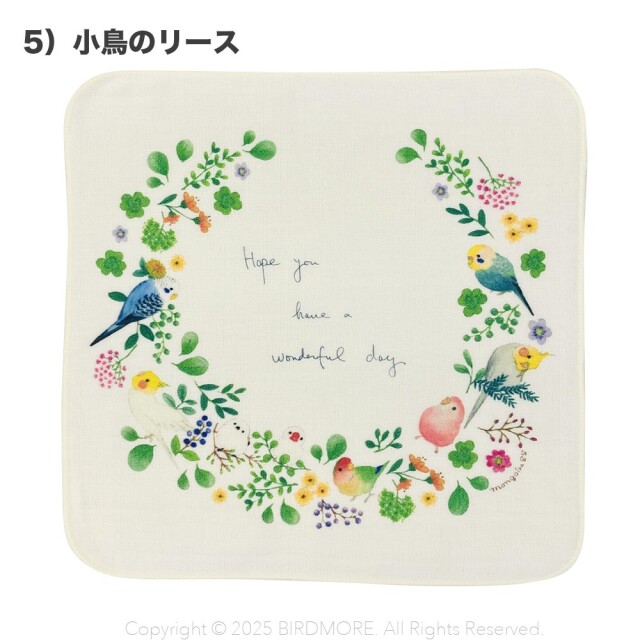 草花のリースに止まっている鳥さん達が可愛い表ガーゼ、裏パイルの吸水性がよいハンカチです。鳥好きさんへプレゼントしても喜ばれます。