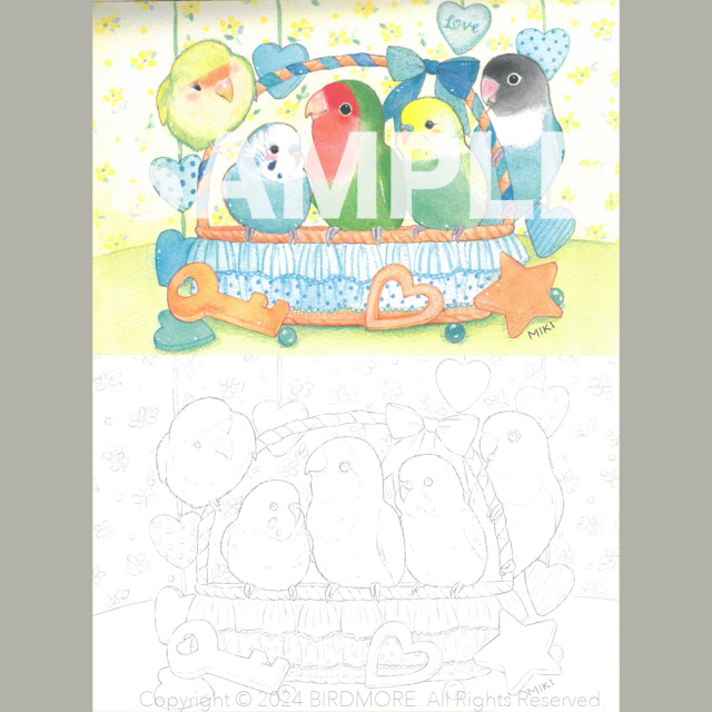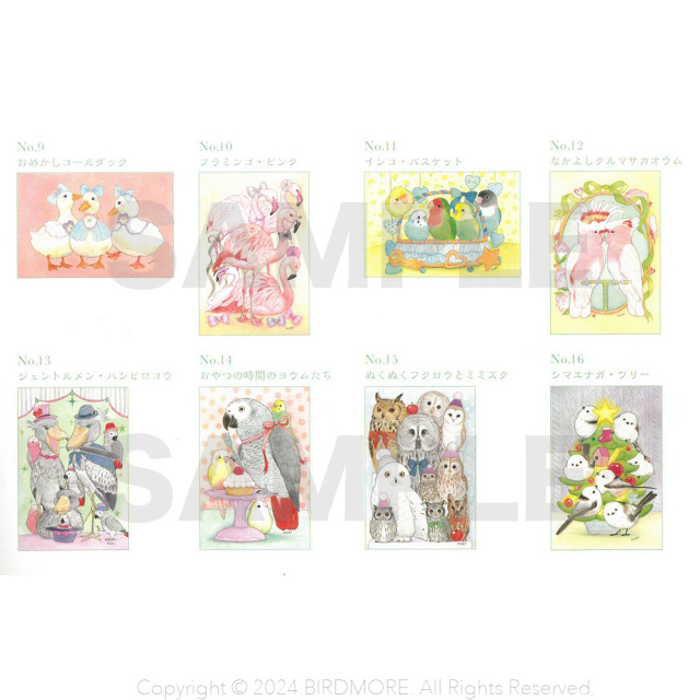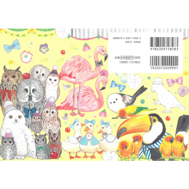 コザクラインコ、セキセイインコ、文鳥、フクロウ、ハシビロコウ、白鳥、フラミンゴ、ハチドリ、オウムなど、鳥好き必見のカラフルで楽しくかわいい16柄を収録。