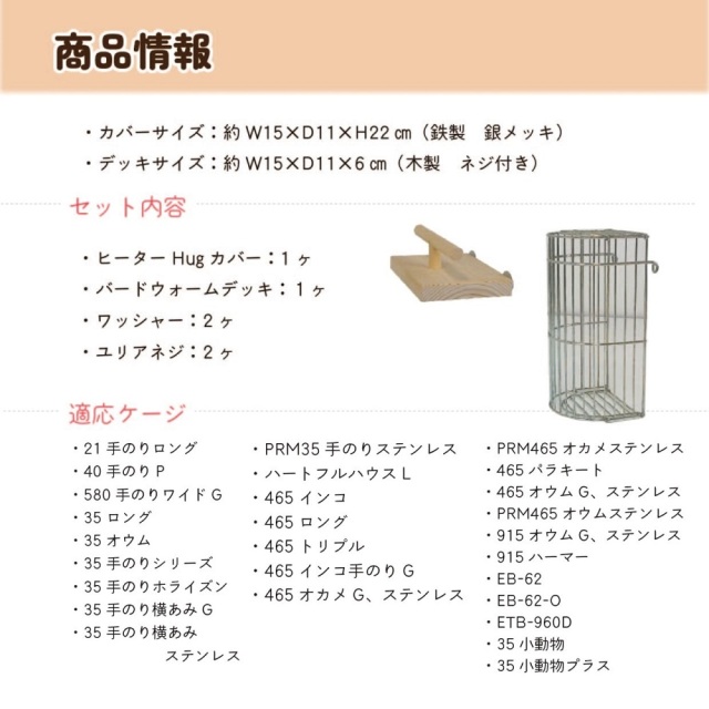 セット内容/ヒーターHugカバー1ケ、バードウォームデッキ1ケ、ワッシャー2ケ、ユリアネジ2ケ