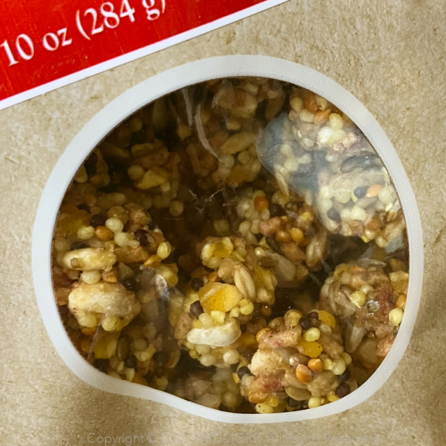 トウモロコシ、殻なし白キビ、殻なしオーツ麦ピーナッツ、殻なしカナリアグラスの種、赤キビ、大豆ミール、ベニバナ、マルトデキストリン、菜種、小麦粉、リンゴ、コーンシロップ、リン酸二カルシウム、コーン油、グリセリン、天然香料、ゼラチン、米粉、乾燥全卵、コーングルテンミール、キャノーラ油、石灰石粉、ヨウ素添加塩、DL-メチオニン、塩化コリン、クエン酸(保存料)、天然着色料、マンガンタンパク質化合物、亜鉛タンパク質化合物、ビタミンEサプリメント、ビタミンC(アスコルビン酸)、ビタミンB3(ナイアシン)、酸化マンガン、銅タンパク質化合物、ベータカロチン、ビタミンB5(パントテン酸カルシウム)、酸化亜鉛、ビタミンB7(ビオチン)、亜セレン酸ナトリウム、ビタミンB2 (リボフラビン)、メナジオンナトリウム重亜硫酸塩複合体(ビタミンK活性源)、ビタミンB6(ピリドキシン塩酸塩)、ビタミンAサプリメント、ビタミンB1(チアミン硝酸塩)、ビタミンB12サプリメント、混合トコフェロール(保存料)、ビタミンB9(葉酸)、ビタミンD3サプリメント、銅メチオニンキレート